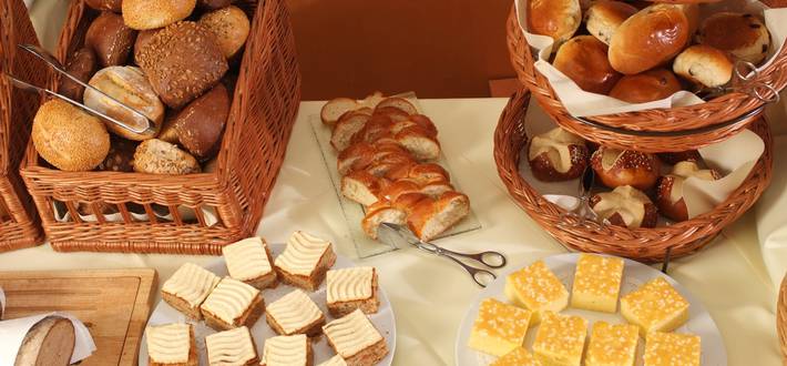 Bei unserem reichhaltigen Frühstücksbuffet wählen Sie aus einer Vielzahl von Brot und Brötchen, Croissants, Müsli, Cerealien, frisches Obst, Schnittkäse, Schinken, Wurstaufschnitt, Rühreier, Bacon, gekochte Eier, Konfitüren und Honig. Hinzu kommen verschiedene Säfte, Kaffee und Tee so viel Sie möchten.