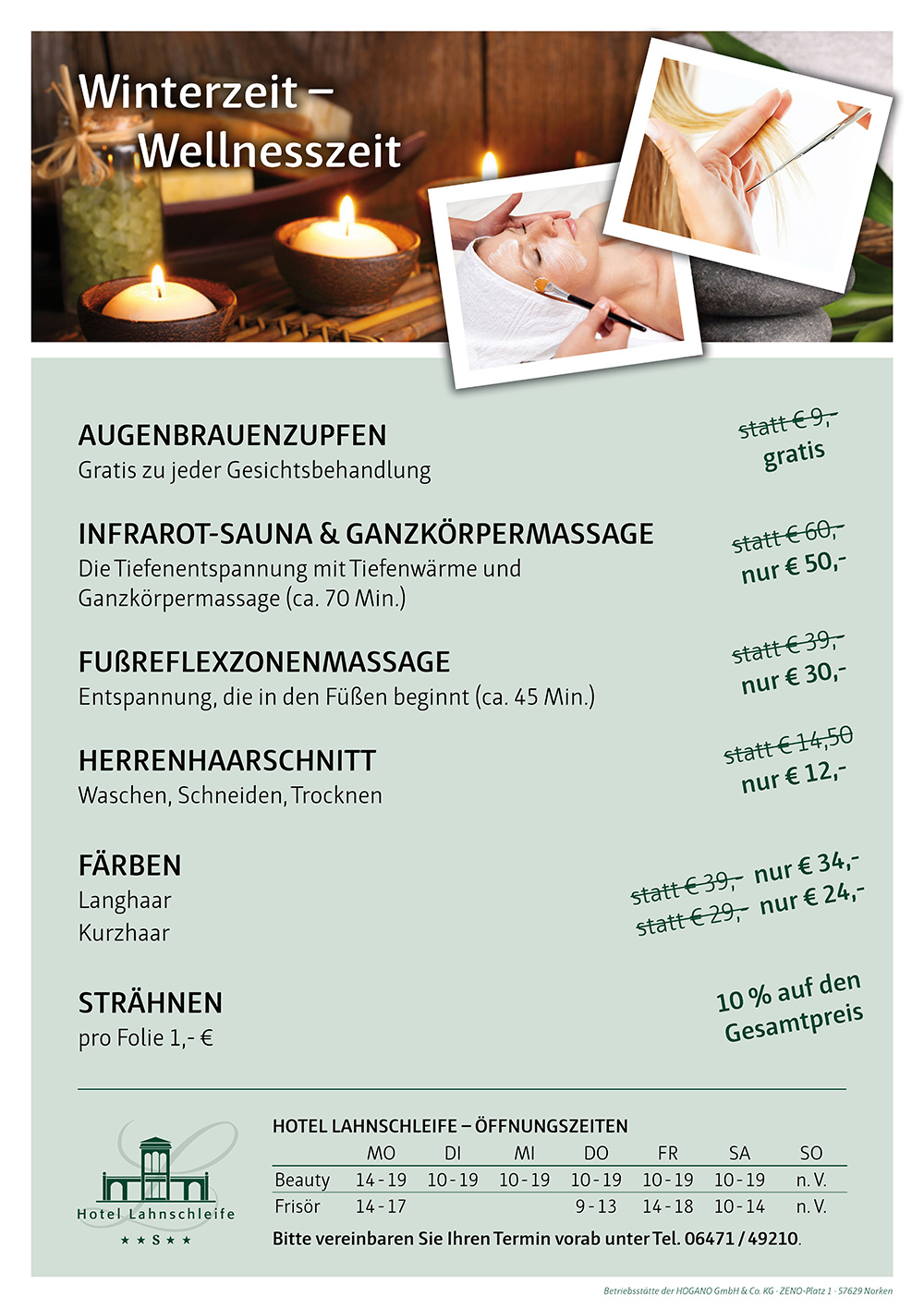 Mit unseren aktuellen Angebote im Beauty-Center und Frisörsalon bereiten Sie sich ideal auf die Feiertage vor. Vereinbaren Sie noch heute Ihren Wunschtermin unter 06471/49210.
